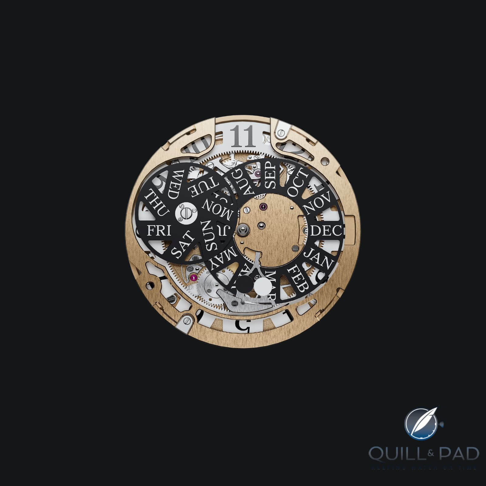 Berneron notes that, to ensure smooth operation, the movement incorporates four springs designed to gradually accumulate the energy needed to instantly advance the indicators. As there are fewer springs than jumping indicators, it is assumed that the date and day of the week share one spring. Having five jumping indicators in a single movement is highly complex and therefore risky, requiring significant expertise and experience to ensure proper functioning.