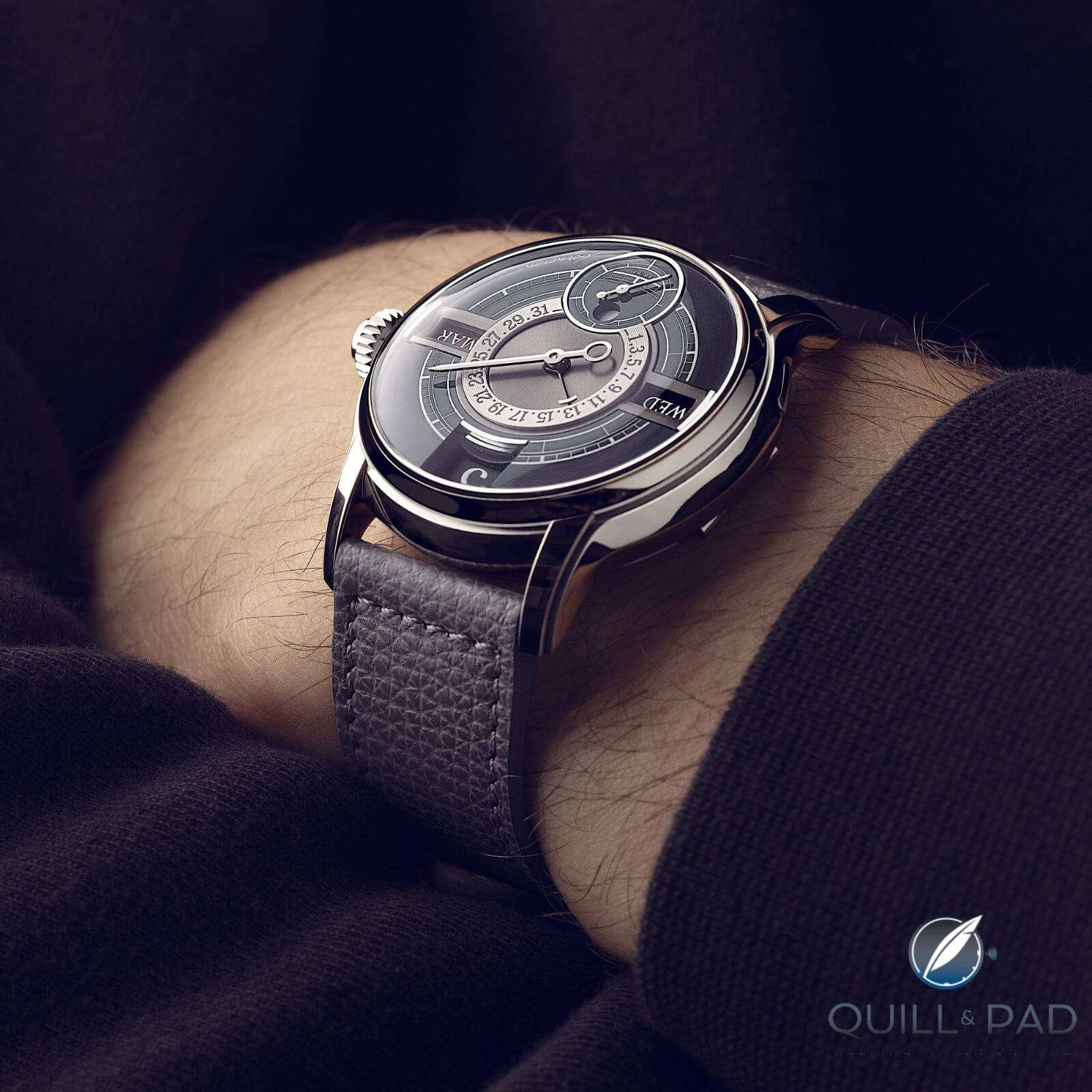 Let us begin our review of the watch with the dial, as it is the first feature to catch the eye. Berneron refers to his chosen dial structure as a “double regulator,” since both the time display – with a jumping digital hour at the top, sweep minutes in the center, and small seconds at the bottom – and the calendar displays – with the day of the week on the left, the retrograde date in the center, and the month on the right – are arranged according to the regulator dial principle and are intuitively clear for reading the time and date.