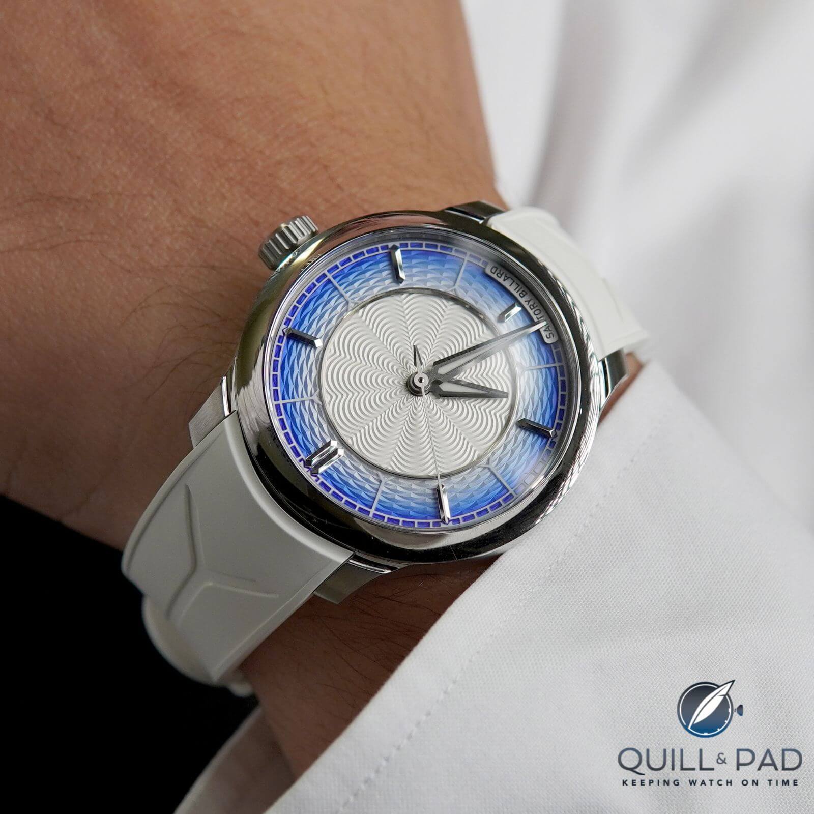 Completing the watch is a white rubber strap fitted seamlessly to the lugs, contributing to the watch’s ergonomic wear. The 20mm band width strikes a balanced proportion, enabling a wide variety of future strap alternatives. Sartory Billard features a quick-release system that allows strap changes without tools and encourages owners to experiment with different looks depending on their mood, including the additional stainless steel bracelet that comes as an addition.