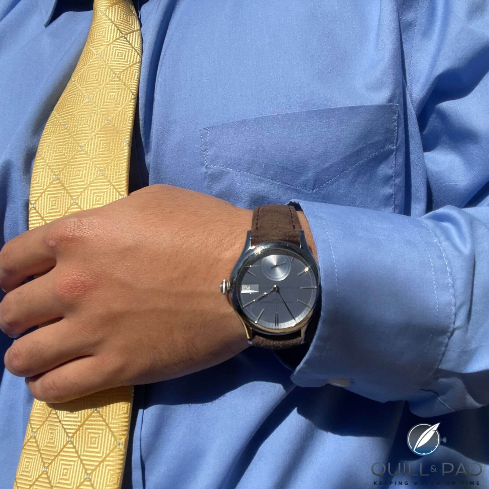Visually, however, it is the dial of the Classic Auto Horizon that is the real novelty here. A study in restraint, it appears calm, tranquil and beautifully balanced thanks to being laced with thoughtful details like the recognisable sloped date and sailed small seconds sub-counter. Delicately finished, the dial politely invites the wearer to linger on its details for a moment – an attribute that enables the wearer to slow down and enjoy the passage of time through a canvas that is neither overtly vibrant nor too muted.