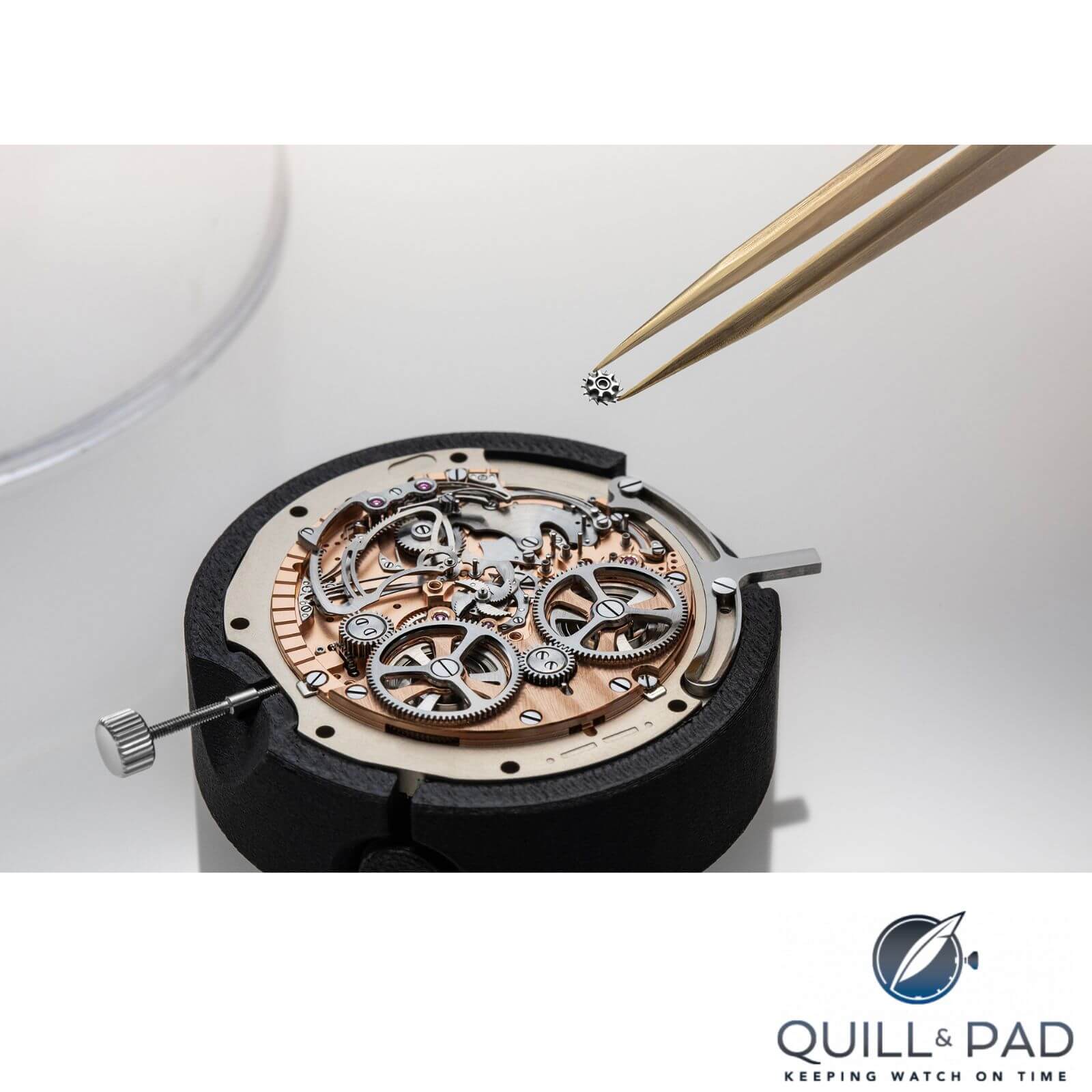 The real complexity congregates around the 12 o’clock position, where the flying governor sits. This intricate little mechanism that will spin when the repeater is activated ensures that the striking runs at an even pace. Just above it, four hammers strike four very thin gongs to produce a Westminster chime. As Greisler readily admits, striking hours, quarter hours and minutes in precise sequence is not entirely happy company for a regulatory system that depends on microvibrations for its consistency. He illustrates the conflict with an image: two people marching across a suspension bridge. As the bridge begins to sway beneath them, it will create unpleasant anti-phase rhythm. The resonance watch faces exactly that kind of interference each time it chimes. Any disturbance to the resonance between the two escapements, however, is prevented thanks to the clutch spring.