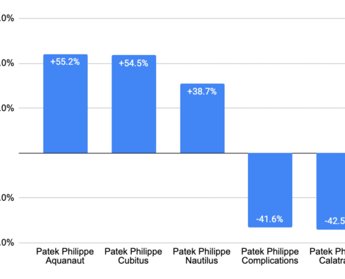 For the fourth month in a row, the picture of performance at the top remains mixed: the WatchCharts Overall Market Index fell by -0.1%, prices for Rolex fell by -0.2% and by -0.3% for Audemars Piguet. However, Patek Philippe prices rose by +0.6%.